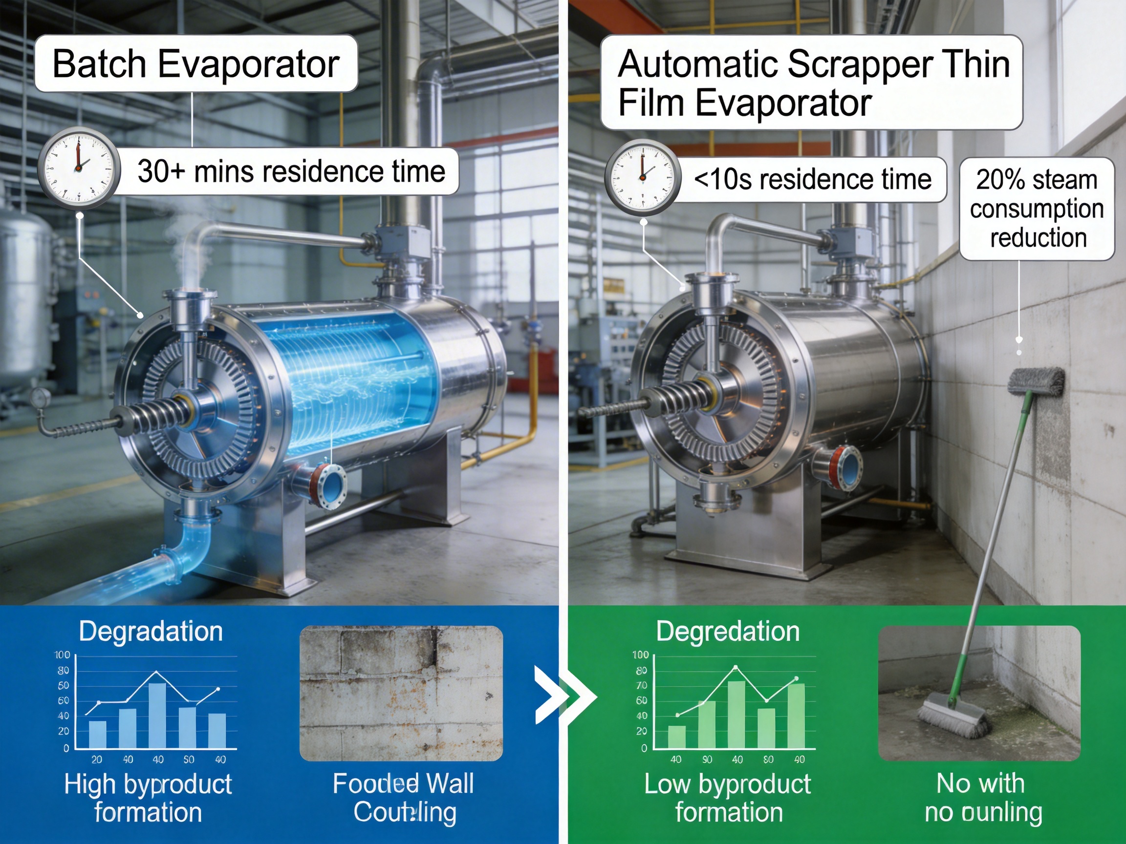 Results: - Purity Increase: Product purity rose from 96% to 99.2%, meeting the strict requirements of downstream pharmaceutical clients. - Degradation Reduction: Thermal degradation rate dropped from 12% to 2.5%, increasing yield by approximately 10%. - Downtime Reduction: Fouling-related downtime decreased by 60% (from every 2 weeks to every 5 weeks), improving production uptime. - Energy Savings: Steam consumption was reduced by 18%, cutting annual energy costs by $120,000. - Operational Efficiency: The system’s stable operation reduced the need for manual intervention, freeing up staff to focus on other tasks.