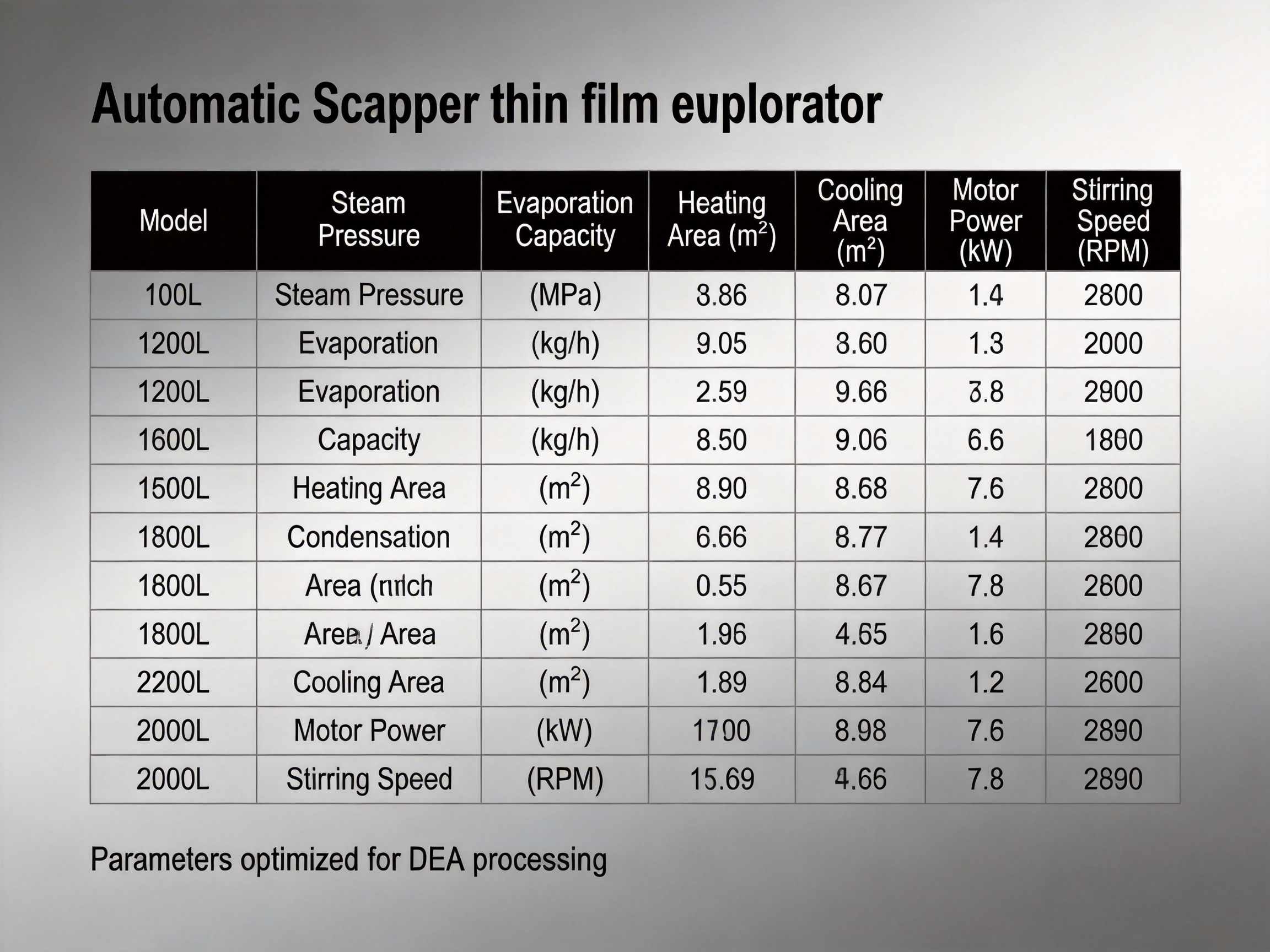 The automatic scrapper thin film evaporator is available in seven models, each designed to meet different production volume requirements. Below are the key parameters for each model: