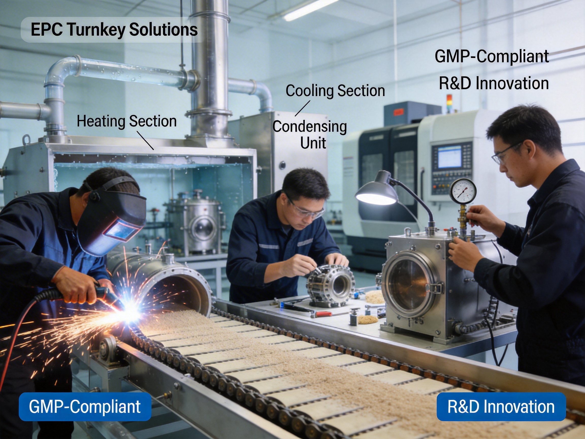 Founded in 2007, the company has a floor area of 16,706 m² and a structure area of 17,800 m², with a dedicated R&D team focused on vacuum drying, fermentation, extraction, and concentration technologies. It absorbs foreign advanced industry-leading technology and invests heavily in R&D to improve product performance. For example, the continuous feeding/discharging under vacuum feature was a result of years of technical innovation.