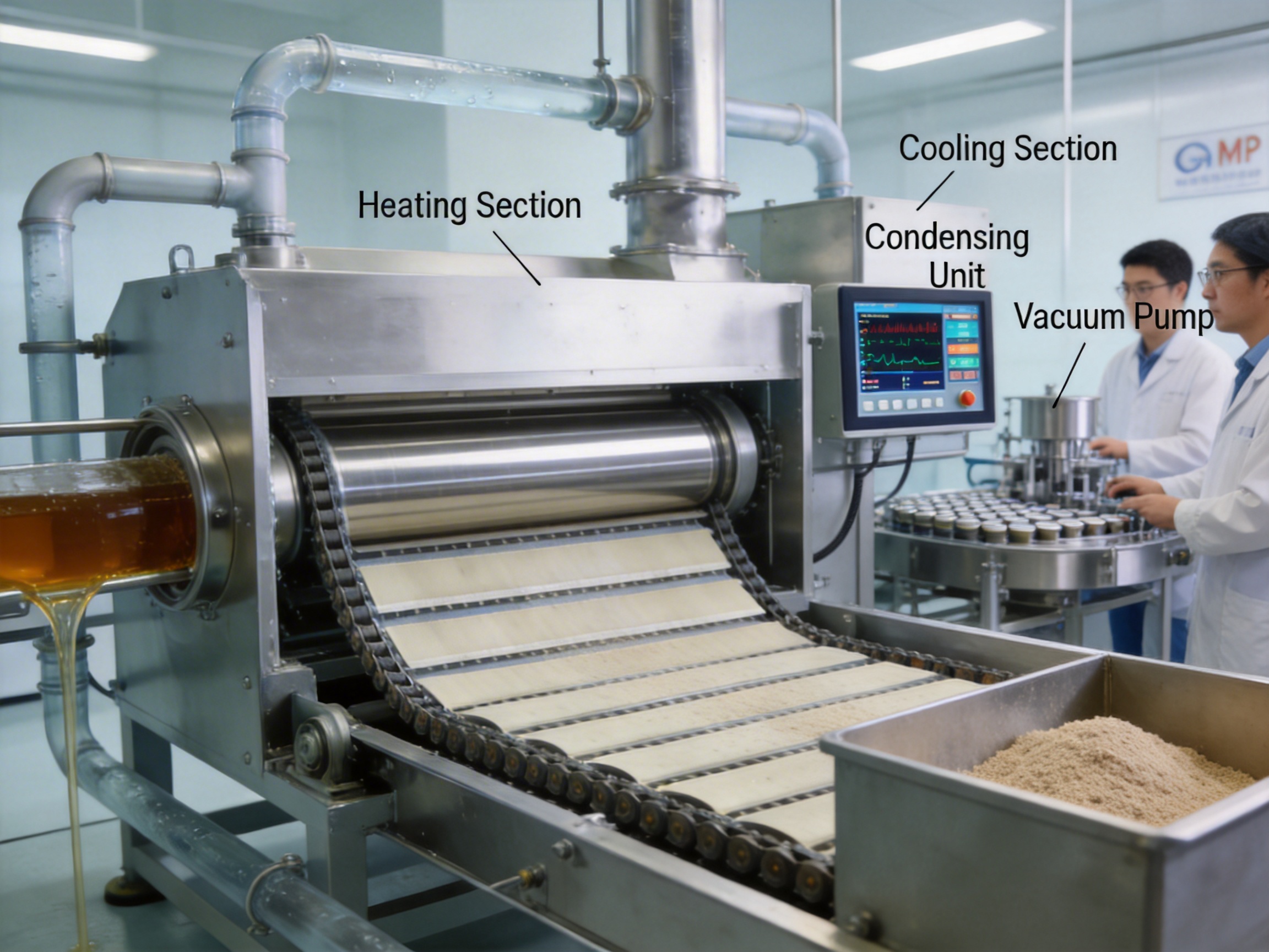 The equipment operates as follows: Materials enter a high-vacuum container where they undergo slow drying over 30 to 60 minutes. This low-temperature vacuum environment prevents degradation of heat-sensitive components (like proteins, vitamins, or active pharmaceutical ingredients). The dried product forms a porous, loose structure with micro-pores at the microstructure level, which enhances instant solubility and flowability—critical for downstream processes like tableting or capsule filling.