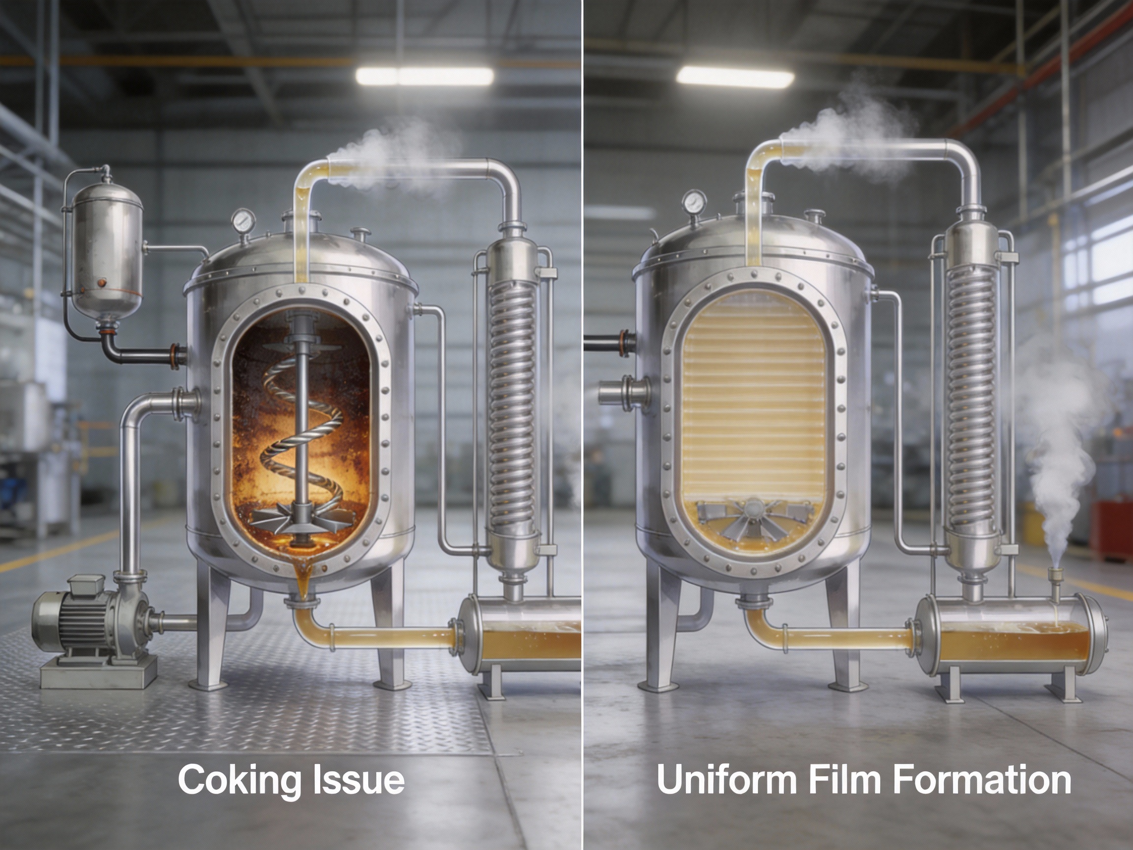 Coking (the formation of burnt or degraded material on the heated surface) and wall sticking are major issues in conventional evaporators processing viscous or heat-sensitive materials. This not only reduces heat transfer efficiency but also contaminates the product and requires frequent cleaning, leading to downtime and increased maintenance costs.
