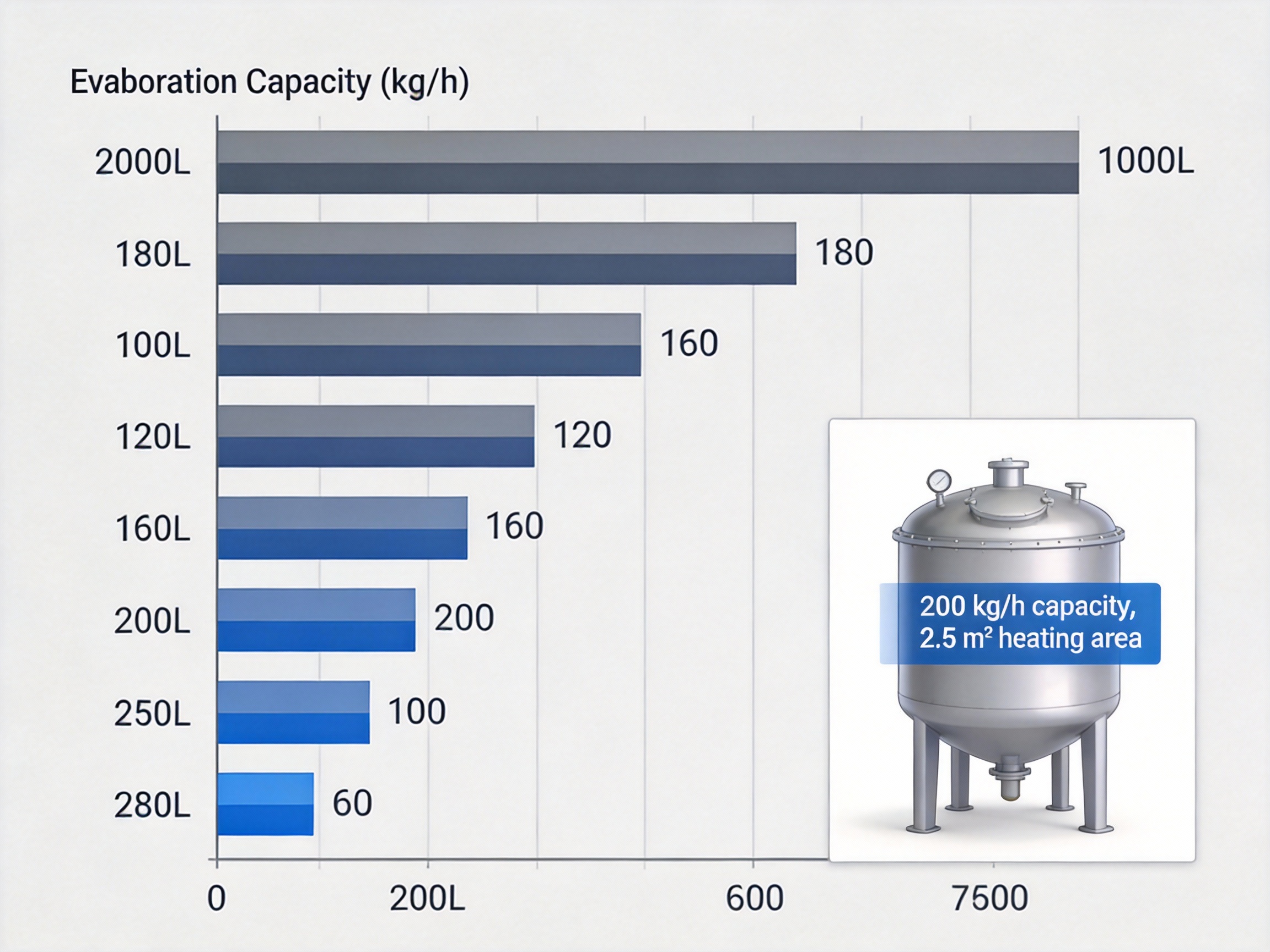 - Evaporation capacity increases with model size, from 60 kg/h for the 100L model to 280 kg/h for the 2000L model. This allows manufacturers to choose the model that best fits their production volume.