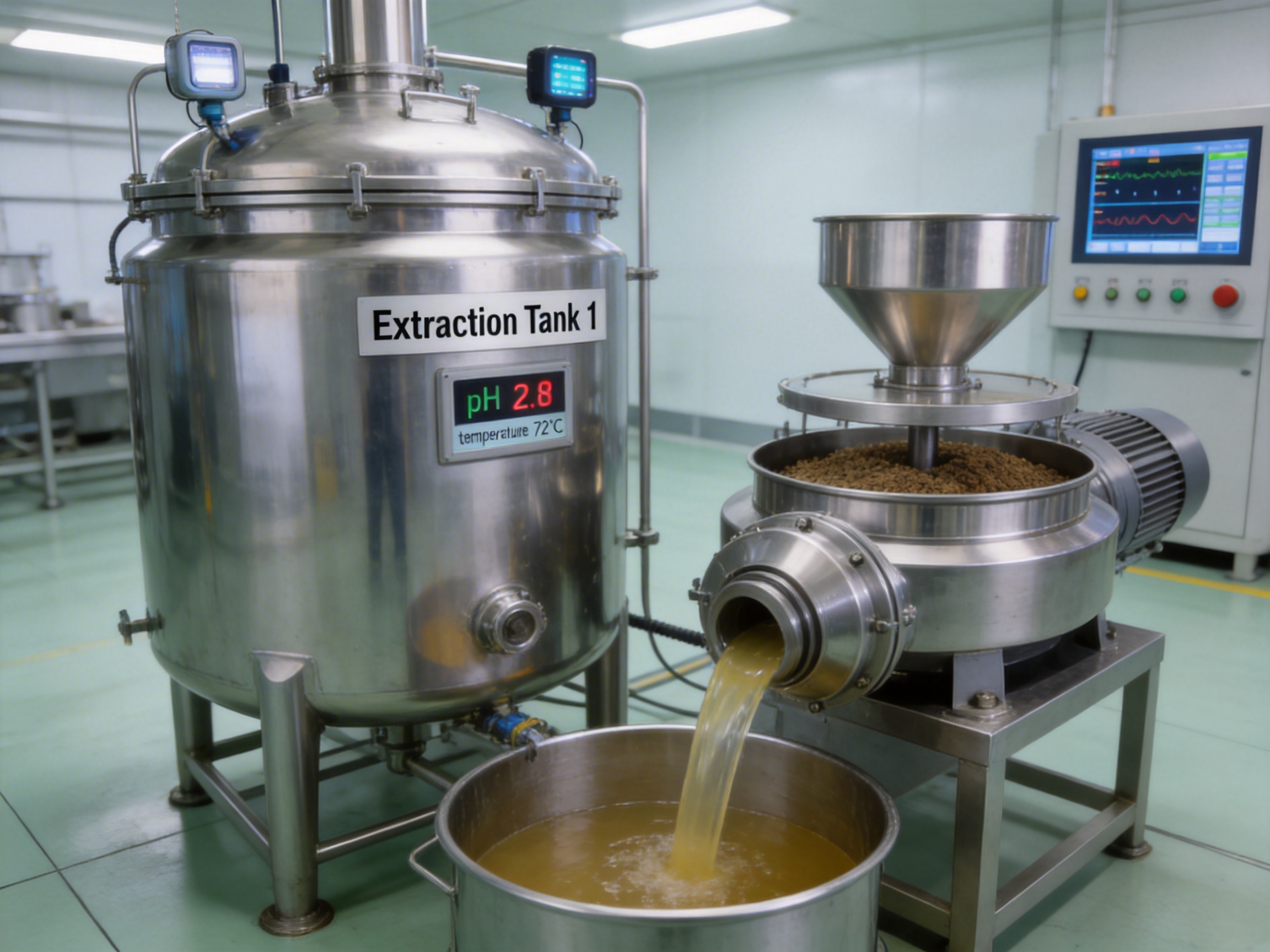 Acid extraction is the traditional method for pectin production, but this line optimizes it using automated control systems. The raw material is mixed with a dilute acid solution (typically citric or sulfuric acid) in a jacketed extraction tank. Sensors continuously monitor and adjust pH (2.5-3.5), temperature (60-80°C), and extraction time (30-60 minutes) to maximize pectin solubility while minimizing degradation. This precise control results in a 10-15% higher yield compared to manual batch extraction.