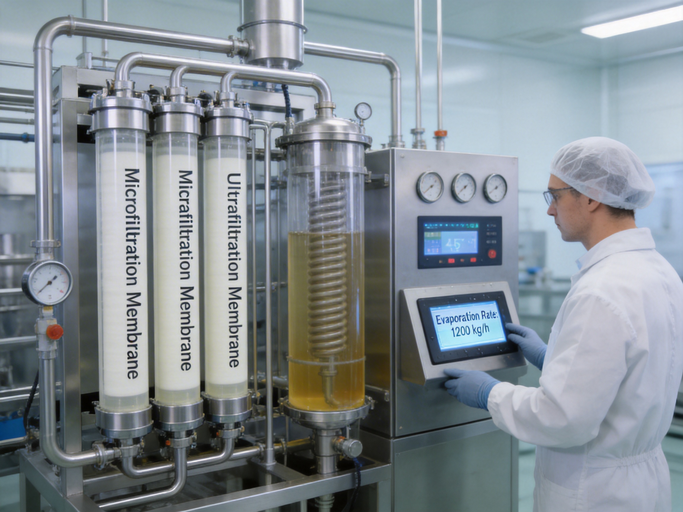 The purified pectin solution is concentrated using vacuum low-temperature evaporation. This method reduces the boiling point of the solution to 40-50°C, preventing pectin degradation (which occurs at temperatures above 60°C). The evaporator uses a heat recovery system to reuse waste heat from the condensation process, reducing energy consumption by 25% compared to atmospheric evaporation systems.