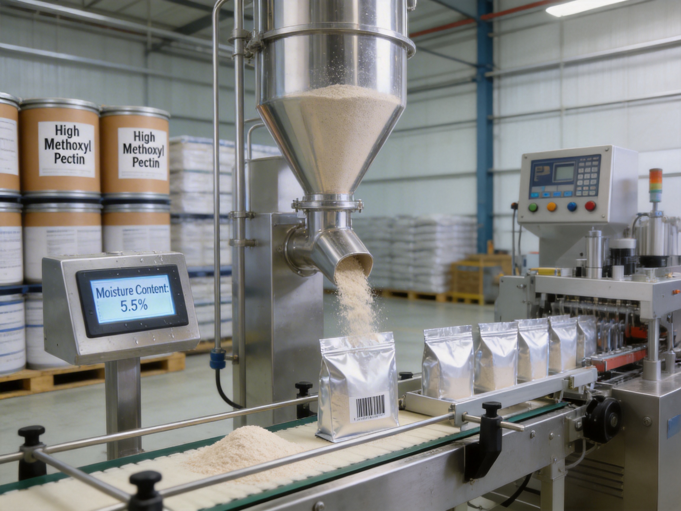 The concentrated pectin solution is dried using either spray drying (for powdered pectin) or vacuum drying (for granular pectin). Spray drying is preferred for large-scale production, as it produces a fine, free-flowing powder with consistent moisture content (5-6%). The dried pectin is then packaged in aseptic containers (aluminum pouches or food-grade plastic drums) to maintain shelf life (up to 2 years) and prevent contamination. The packaging line is fully automated, with barcode scanners for traceability.