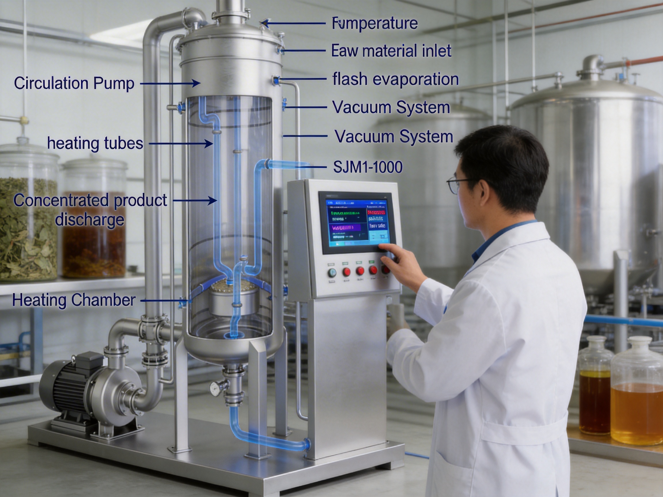 High flow rates in the heating tubes create turbulent flow, which disrupts the boundary layer between the tube wall and the material. This disruption increases heat transfer coefficients by 20–30% compared to natural circulation evaporators (Smith, 2020). The result is faster concentration times: the SJM1-1000 model can concentrate 1000 kg/h of TCM extract from 11.5% to 48% in 2 hours—50% faster than a comparable natural circulation evaporator (Zhejiang Shuangzi, 2023).