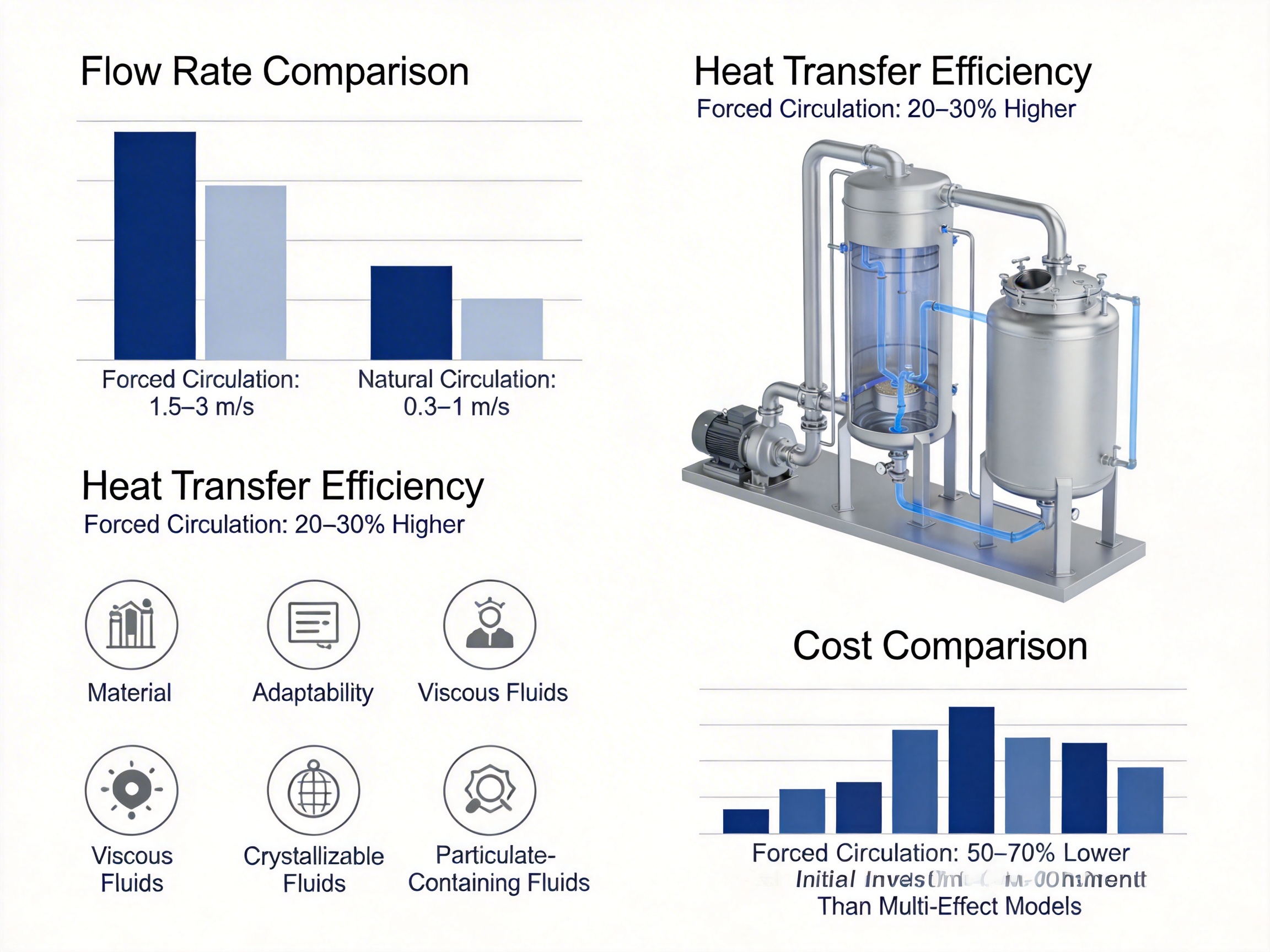 A: Forced circulation achieves flow rates of 1.5–3 m/s—three to ten times higher than natural circulation. This turbulent flow reduces residence time in heating tubes, preventing coking and crystallization, and increases heat transfer efficiency by 20–30%.