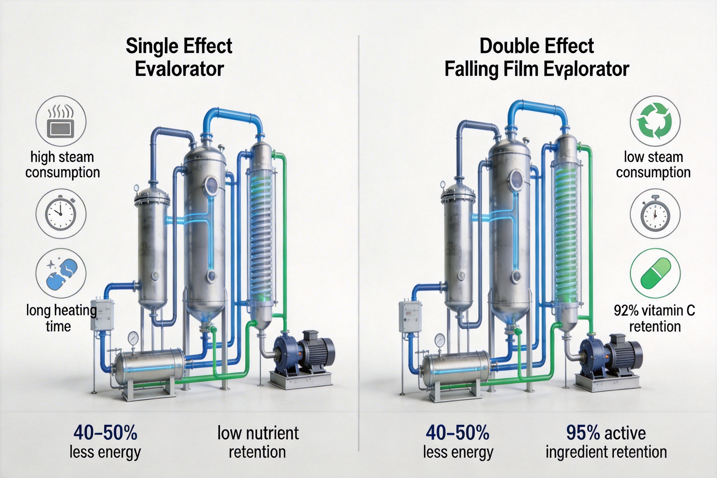 A: The key difference is energy efficiency. Single-effect evaporators use fresh steam for heating, while double-effect systems recycle secondary steam from the first effect as the heating medium for the second effect. This reduces energy consumption by 40–50% compared to single-effect models. Additionally, the falling film design ensures shorter heating times (2–5 seconds), protecting heat-sensitive materials.