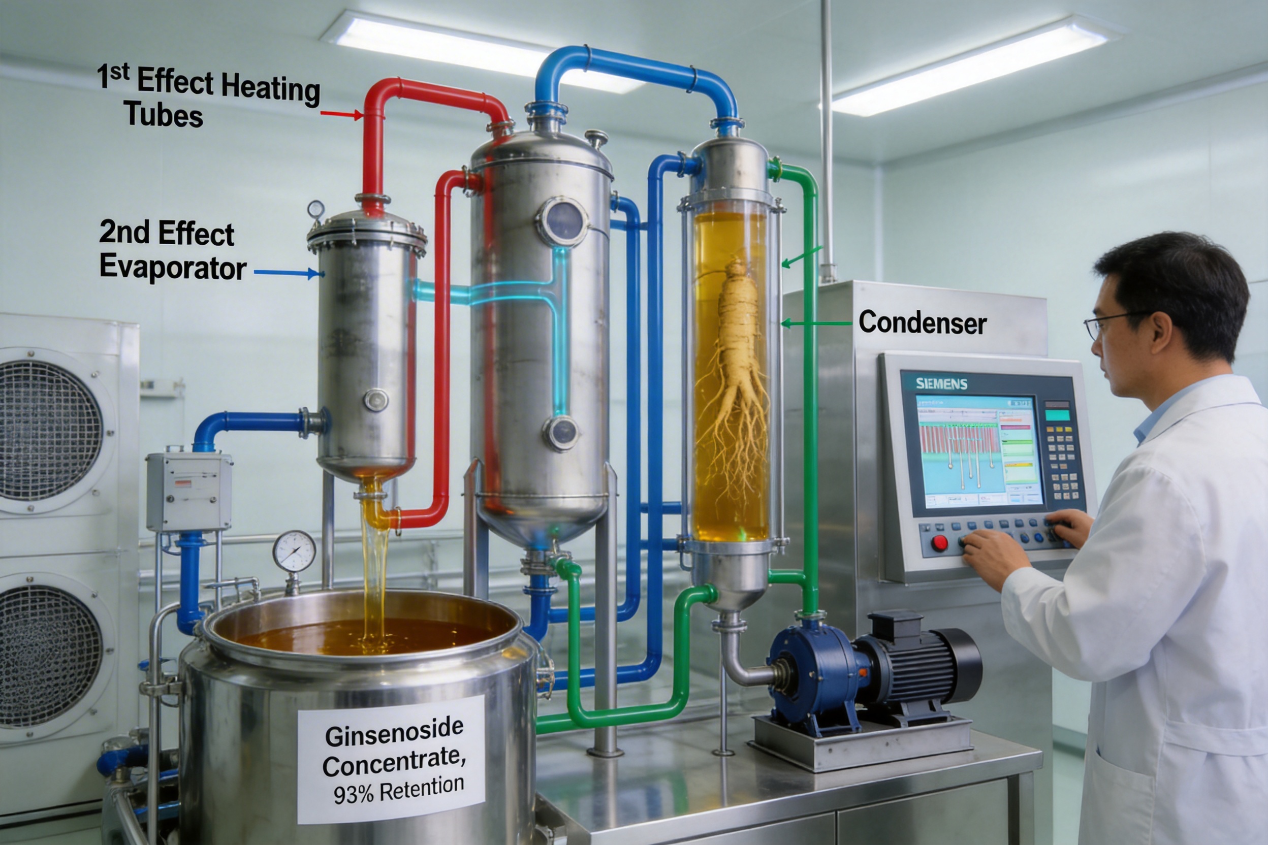 Background: A leading herbal extract manufacturer in Zhejiang, China, was using a single-effect evaporator to concentrate licorice extracts. The system had high energy costs ($120,000 per year), low active ingredient retention (78% glycyrrhizin), and frequent downtime (10% of operating time) due to scaling.
